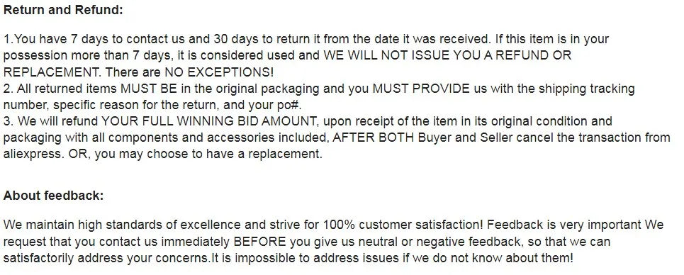 Wrong size? Displeased? No problem! If for any reason you are not satisfied with the product, we offer a 30 day return policy.